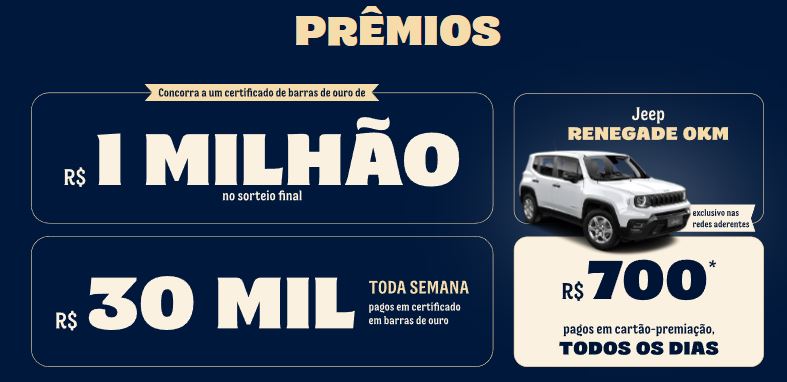 Você pode ganhar R$ 700,00 todos os dias, R$ 30 mil toda semana, um Jeep Renegade 0 km e até R$ 1 milhão em barras de ouro no sorteio final.